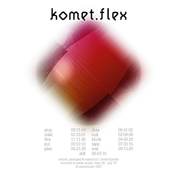 Flex, the second Komet CD follows seamless his first release on rastermusic. The tracks are altogether more straight, less whirr spacy then on the predecessor (exception: the poly rhythmic vibrating title track), the sounds are more sophisticated, the anyhow hardly as melodies to described two-notes-fragments more reduced, without making the music more inaccessible because of that.